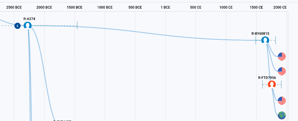 Over this vast expanse of time between 2200BCE and 1700CE sits our first Burgess SNP R-BY60815. This block is huge with over 40 variants within it. Recent test results in November of 2023 between 3rd cousins descended from Benjamin Burgess of Montgomery County Maryland have finally split out a sub-branch labelled R-FTD7956. This sub-branch is thought to have arisen around the 1800s.