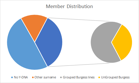 Total membership in the project is 459 of which 105 are matched in 35 distinct Y-DNA lines (Grouped) and 54 Burgess results remain (UnGrouped). Of the remaining 300 members 73 do not have a Burgess surname and 227 have not taken a Y-DNA test.